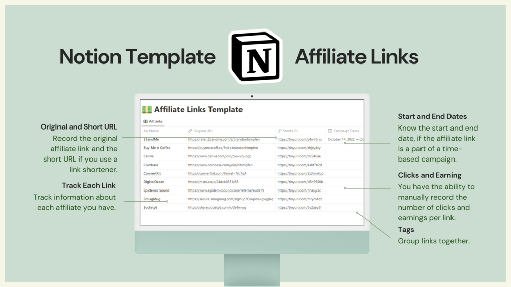 You have the ability to track the original URL, shortened URL, time-bound/ongoing campaign dates, clicks, earnings and group links together using tags.